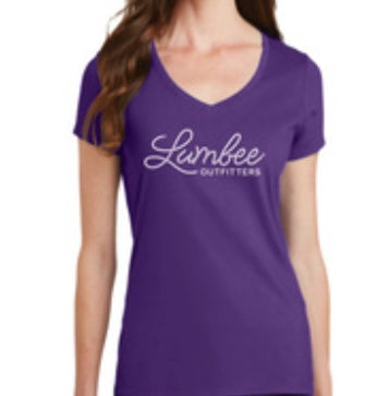 Stun the crowd with this V Neck Ladies fashion fit tee. The front features our classy Rope font LUMBEE OUTFITTERS logo.